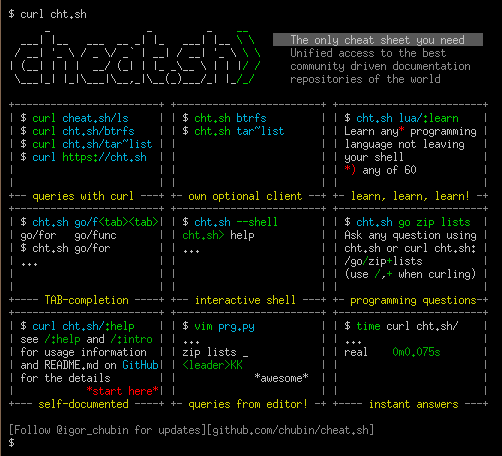 As you can see, you can use both HTTPS and HTTP to access the service, and both the long (cheat.sh) and the short (cht.sh) service names.