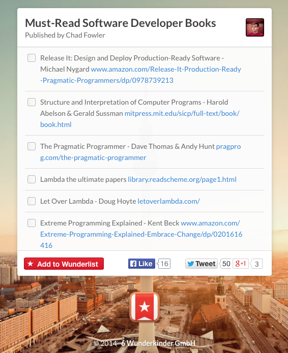 - public/published lists like the excellent "Must-Read Software Developer Books" (https://www.wunderlist.com/lists/70326287)