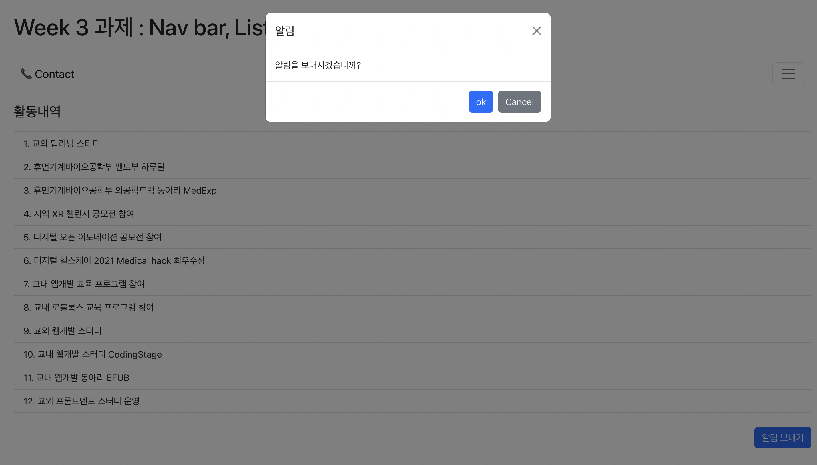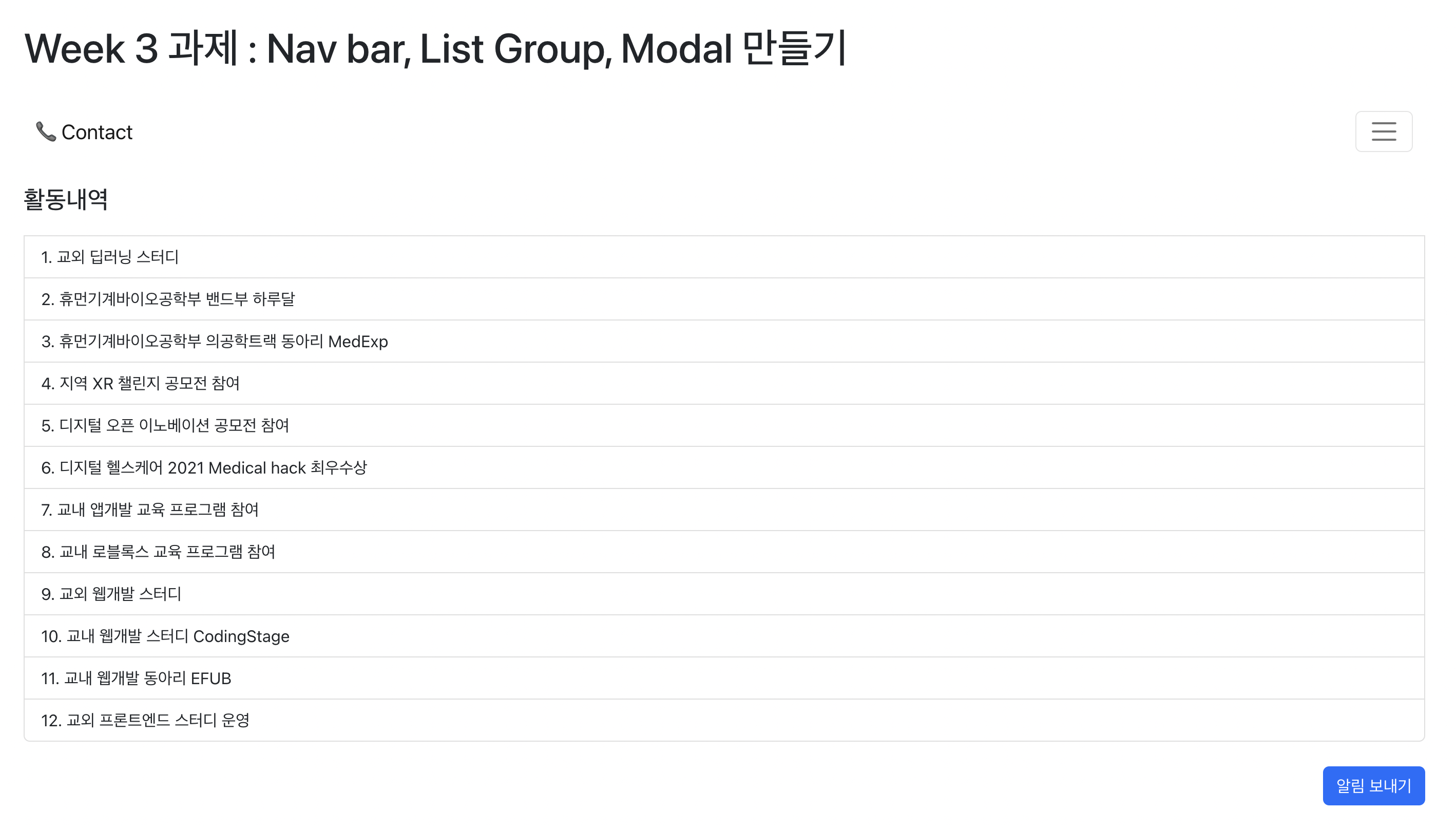 nav bar,list group,modal기능을 활용해 보았습니다.