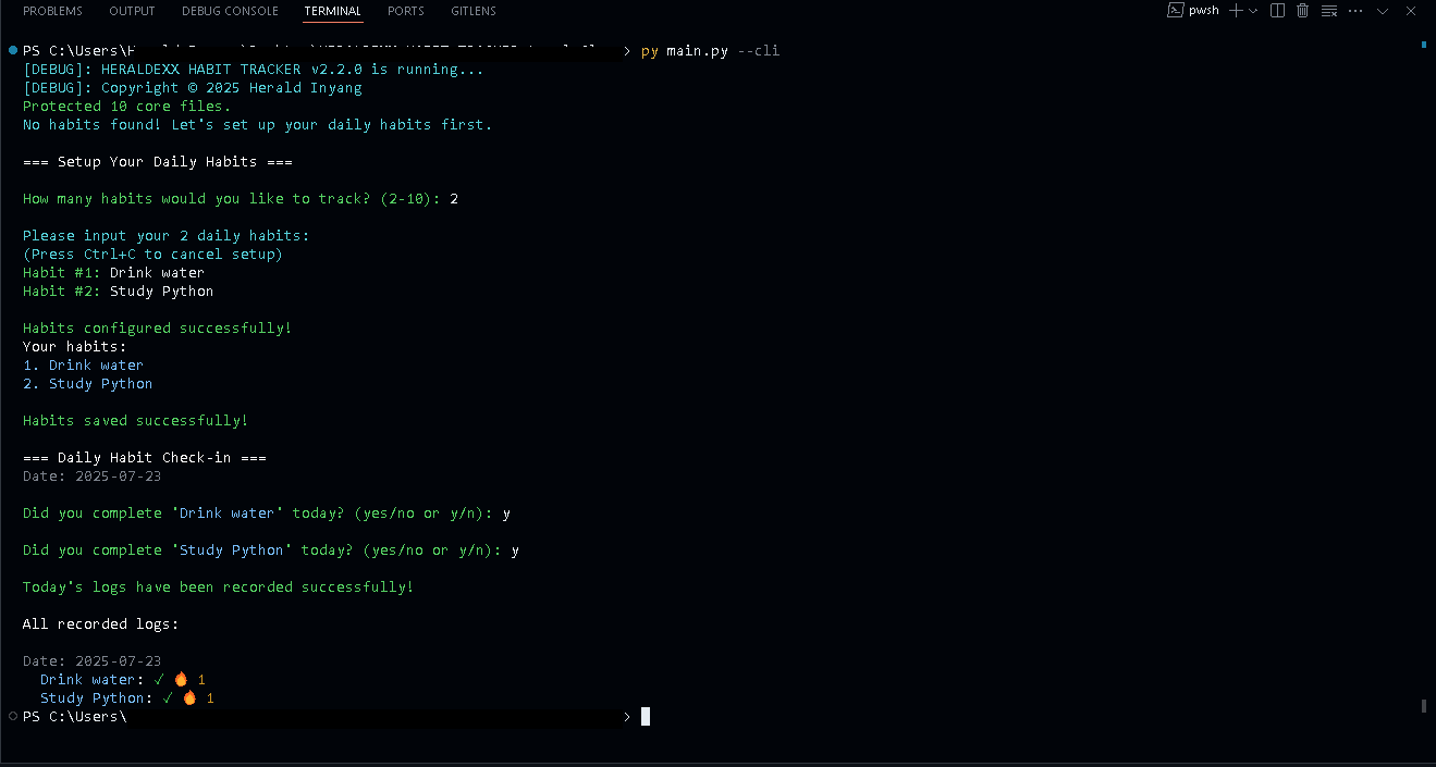 β οΈ Data is stored inC:\Users\<username>\.heraldexx-habit-tracker\data. Ensure this directory is preserved for your logs, streaks, and visualizations.