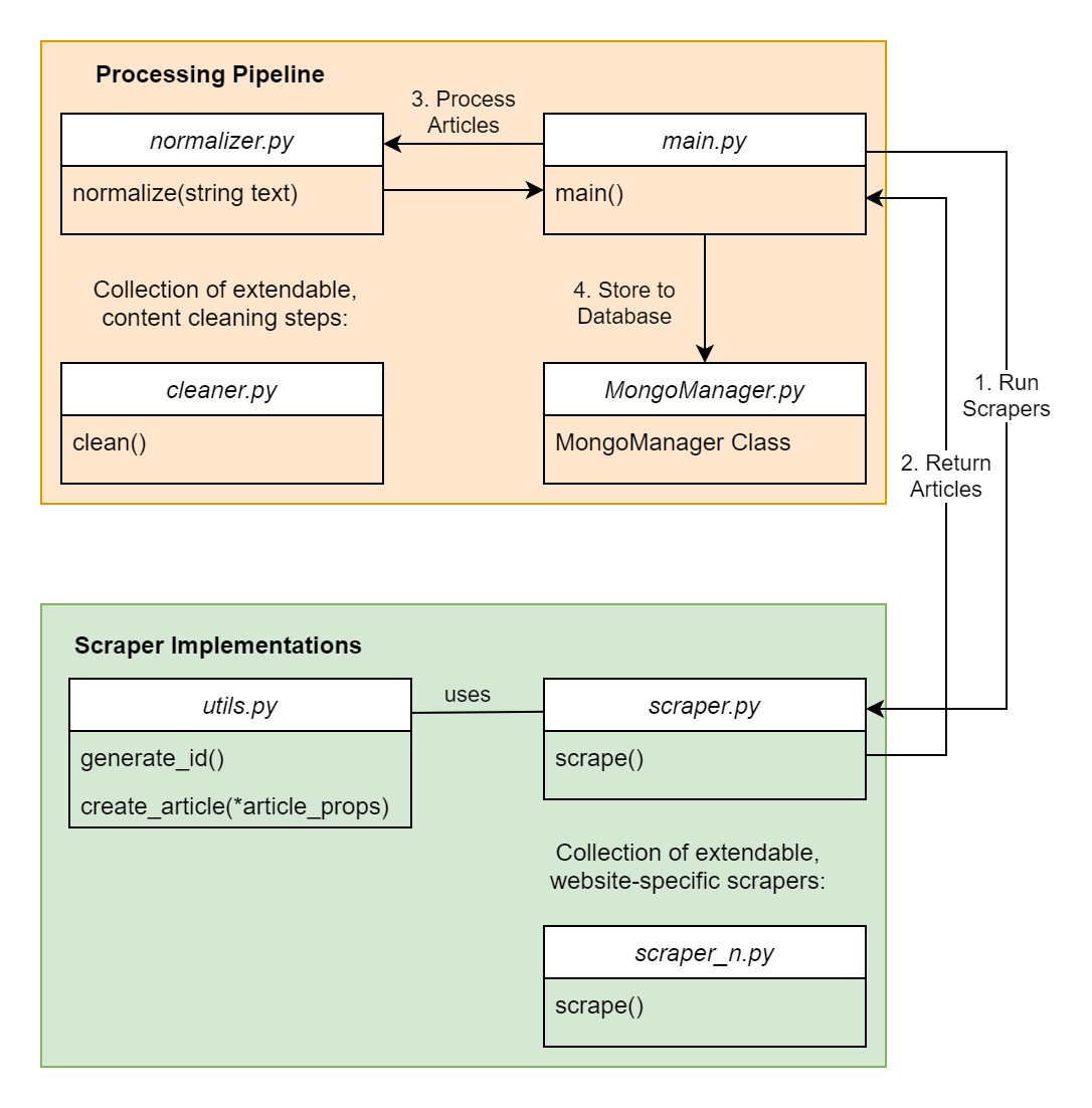 The individual scraper modules (called scrape.py or scrape_n.py) are required to implement a scraping function scrape(). The scraper consists of two main parts. The first part contains the scraper implementations that enable the collection and scraping of online resources. The second part is the processing pipeline for text normalization, cleaning, and subsequent steps before storing them in the database.