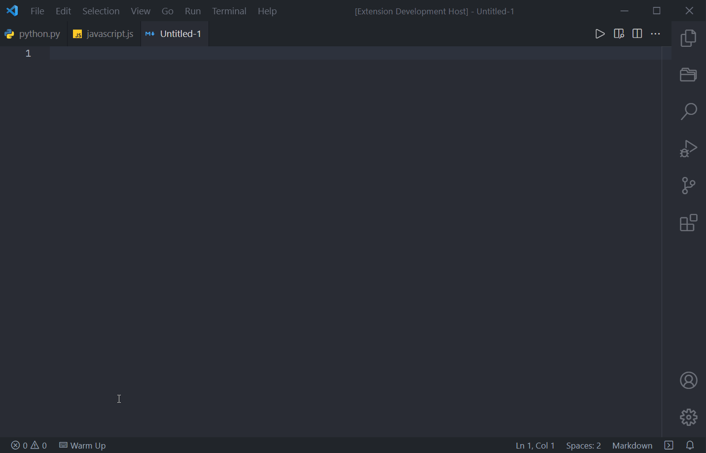 Open the extension panel by clicking on the keyboard icon in the status bar, by entering the ctrl + alt + p shortcut or by hitting ctrl + shift + p and executing the warmUp.start command.
