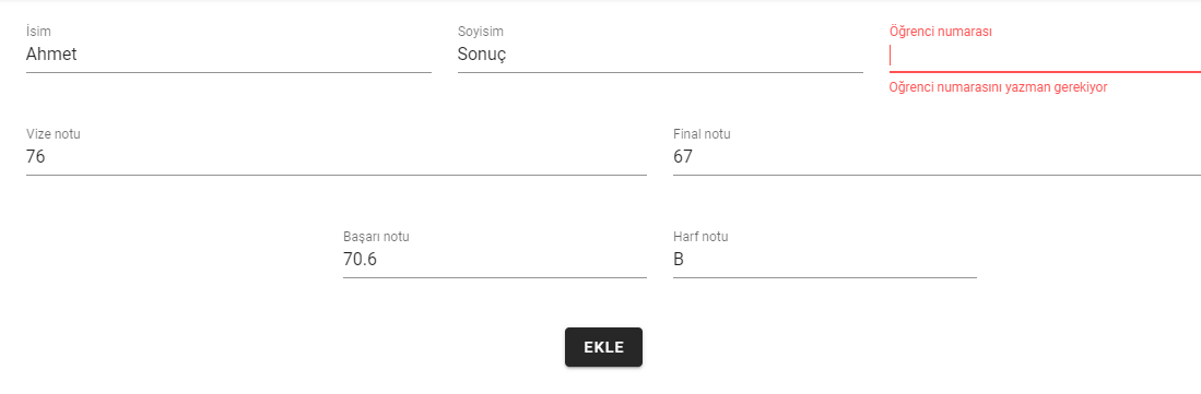 İnternet programlama ödevi Websiteyi açtığımızda böyle bir görüntüyle karşılaşıyoruz Öğrenciler tüm alanlara göre sıralanabiliyor, artı olarak başarı puanlara göre renklendirme de kullandım (vuetify chips) Arama yapabiliyoruz Öğrenci ekleme Alanı boş bıraktıkta gelen hata mesajı Boş olduğu zaman da böyle görünüyor Başarı puanı ve harf notunu hesapladığım kısım ogrenci Project setup npm install Compiles and hot-reloads for development npm run serve Compiles and minifies for production npm run build Lints and fixes files npm run lint Customize configuration See Configuration Reference.
