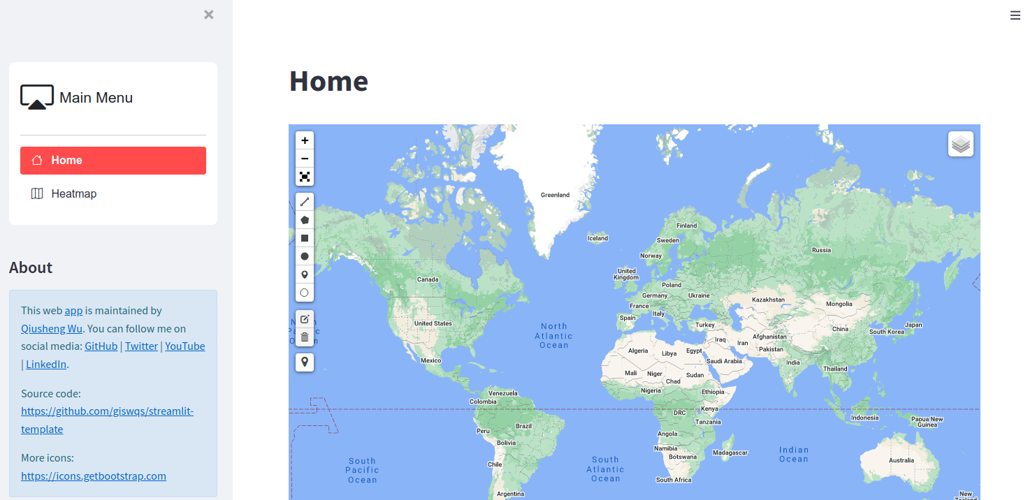 streamlit-template A streamlit app template for geospatial applications based on streamlit-option-menu. App URL: https://share.streamlit.io/giswqs/streamlit-template