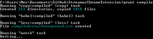 Streamus' CSS is compiled via [LESS](http://lesscss.org/) and much of it's JavaScript is transpiled via [Babel](https://babeljs.io/). Run the following command from your terminal to build a usable version of Streamus:grunt compile