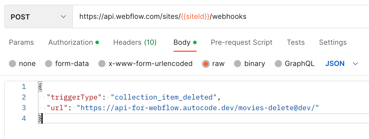 These webhooks must be added through the Webflow API. We can use a tool like Postman to accomplish this.