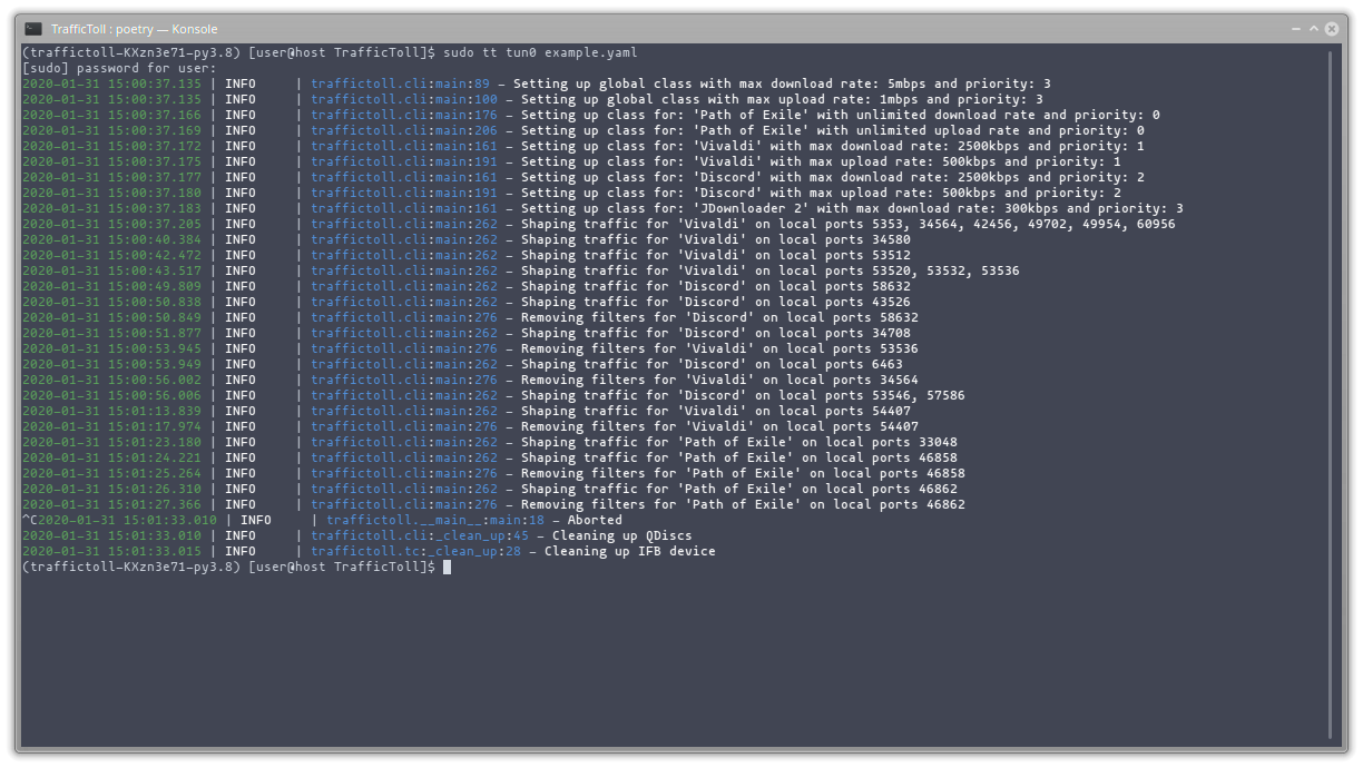 # tt enp3s0 night.yaml --delay 0.5(regular interface, check every half second for change in networked processes)# tt tun0 day.yaml --logging-level DEBUG(VPN interface, adjust logging level to DEBUG)
