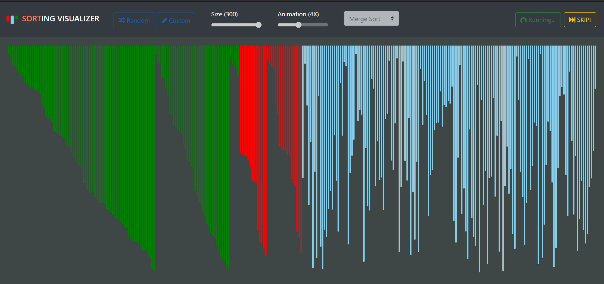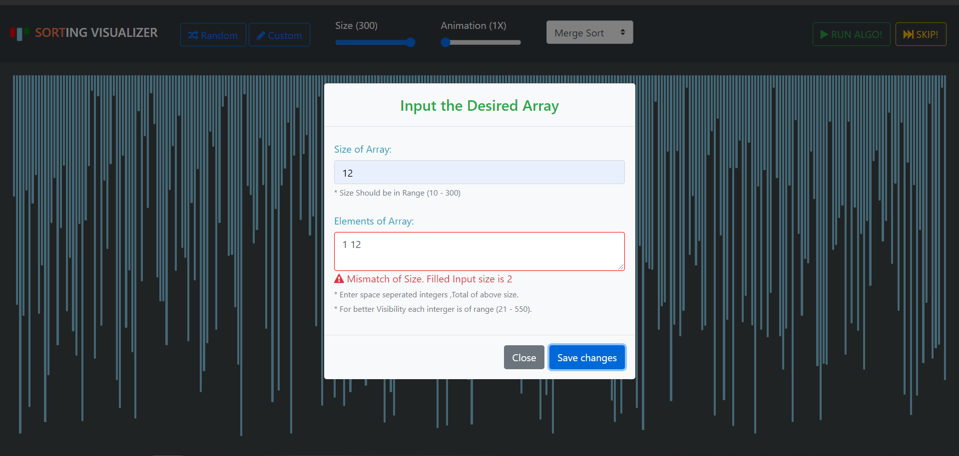 It visualizes 7 different sorting Algorithms on Random/Custom Array at different animation Speeds and Sizes.