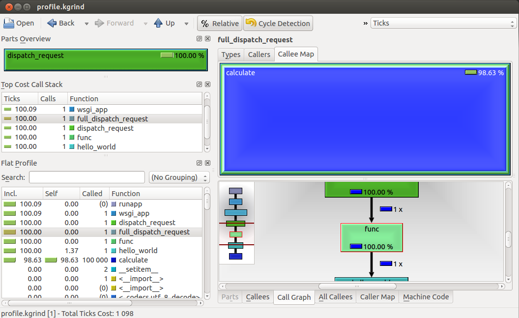 To get a better understanding what's going on within the application and to understand the flow and the performance impact of functions of your application, we used kcachegrind to visualize the call graph and the call map. To use kcachegrind you have to install it