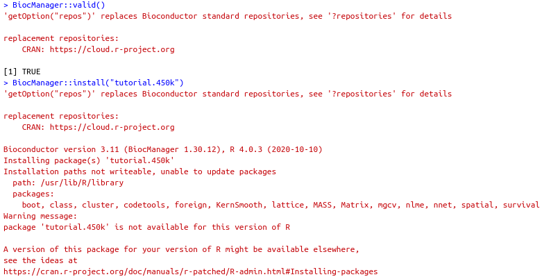Hi, I have been having issue of installing the package "tutorial.450k" using BiocManager::install("tutorial.450k") in R Studio. My R Studio Version is 4.0.5. Please see the error I get in R Studio below:  Can anyone help? Thank you very much!