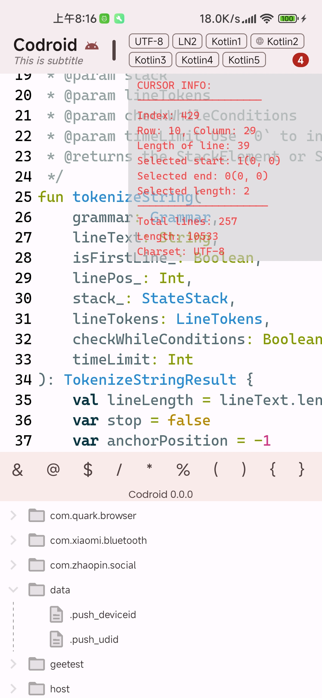 Codroid Codroid is an experimental, customizable text editor on Android. Screenshots Architecture Road Map Add-on module Logger Appearance configuration Add-on loader ... Editor widget Code suggestion (Lsp perhaps) Code high light Status Bar ... Project window