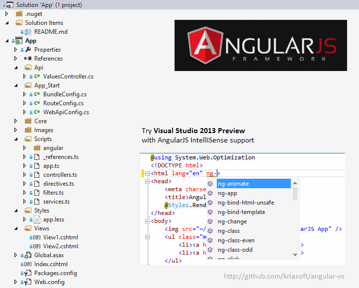 This seed contains AngularJS libraries, test libraries and a bunch of scripts all preconfigured for instant web development gratification. Just clone the repo (or download the zip/tarball), open it in Visual Studio 2012 and you are ready to develop and test your web application.