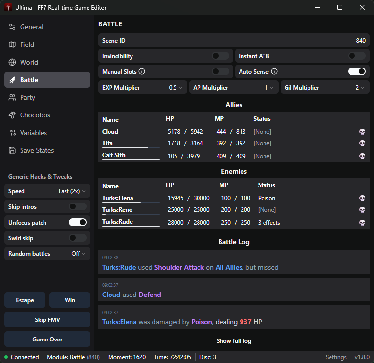 - show and edit ally and enemy information (HP, MP, statuses, ATB), instant kill