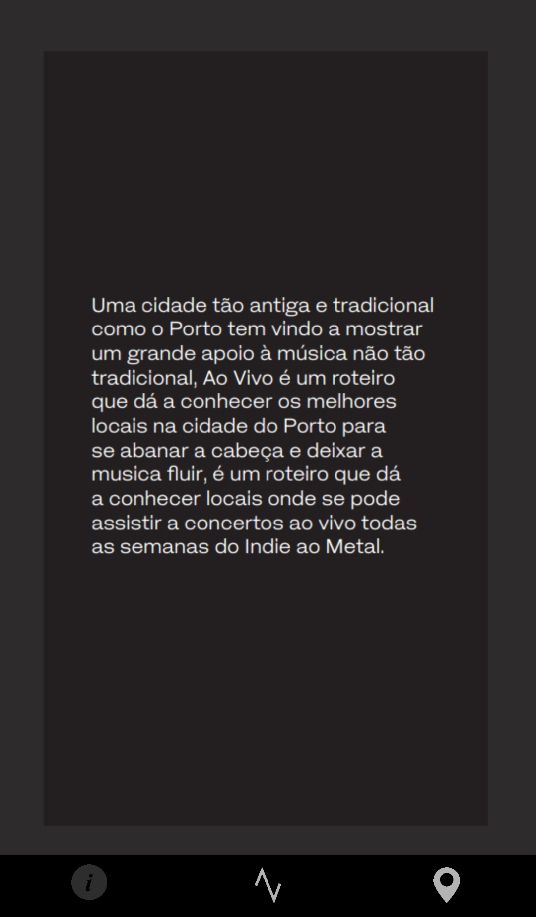 Ao Vivo is an App that guides you through venues in the city of Porto where you can go to gigs from Indie Rock to Heavy Metal.