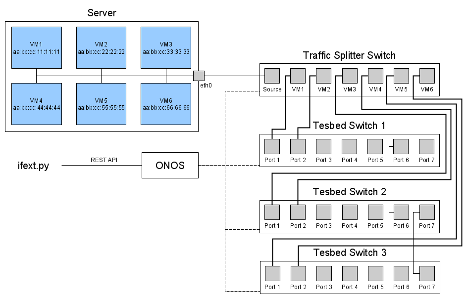 IFEXT manages the flow rules required to disperse traffic coming from a source port across multiple different switch ports. This is done based on a port-to-MAC mapping provided by the user. This tool also manages the configuration needed to suppress topology discovery on the switch.