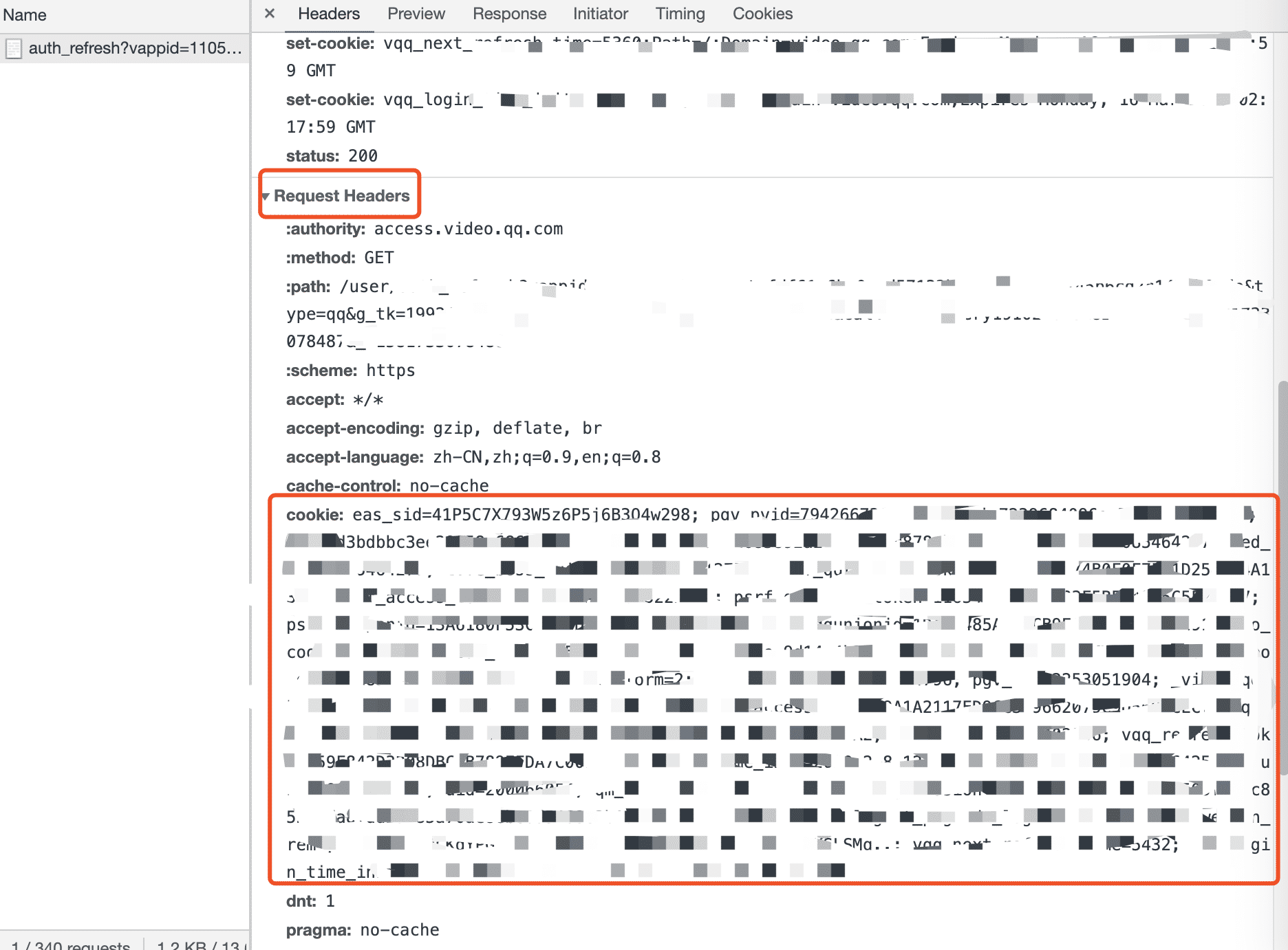 'Cookie': 'tvfe_boss_uuid=***********; pgv_pvid=***************; video_guid=***************; video_platform=2; pgv_info=ssid=****************; pgv_pvi=****************; pgv_si=***************; _qpsvr_localtk=*************; ptisp=; ptui_loginuin=***************; RK=****************; ptcz=*********************; main_login=qq; vqq_access_token=************; vqq_appid=101483052; vqq_openid=*************; vqq_vuserid=*************; vqq_vusession=' + cookie['vqq_vusession'] + ';'