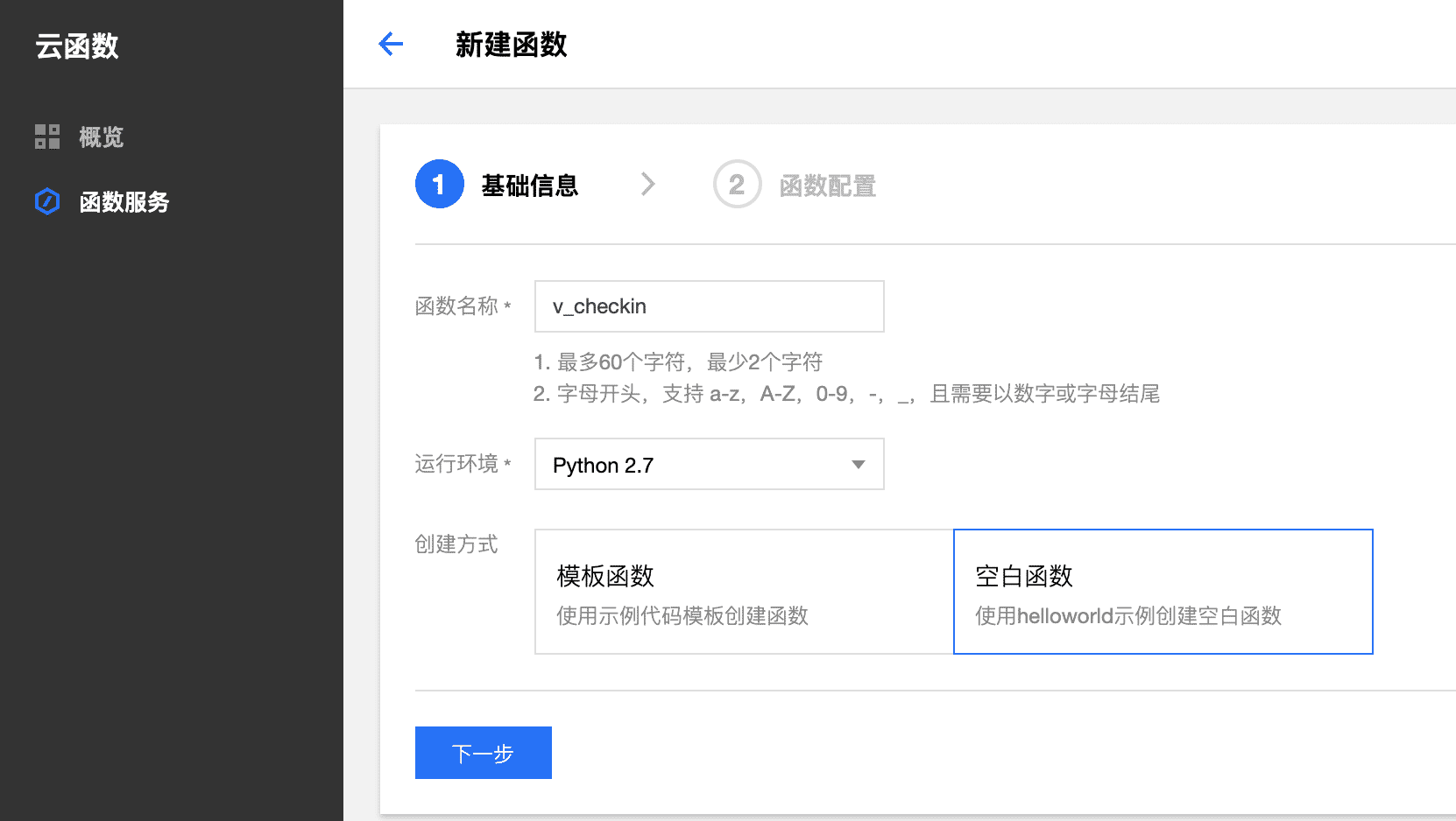 - 在“新建函数”页面填写函数基础信息,单击【下一步】。如下图所示: