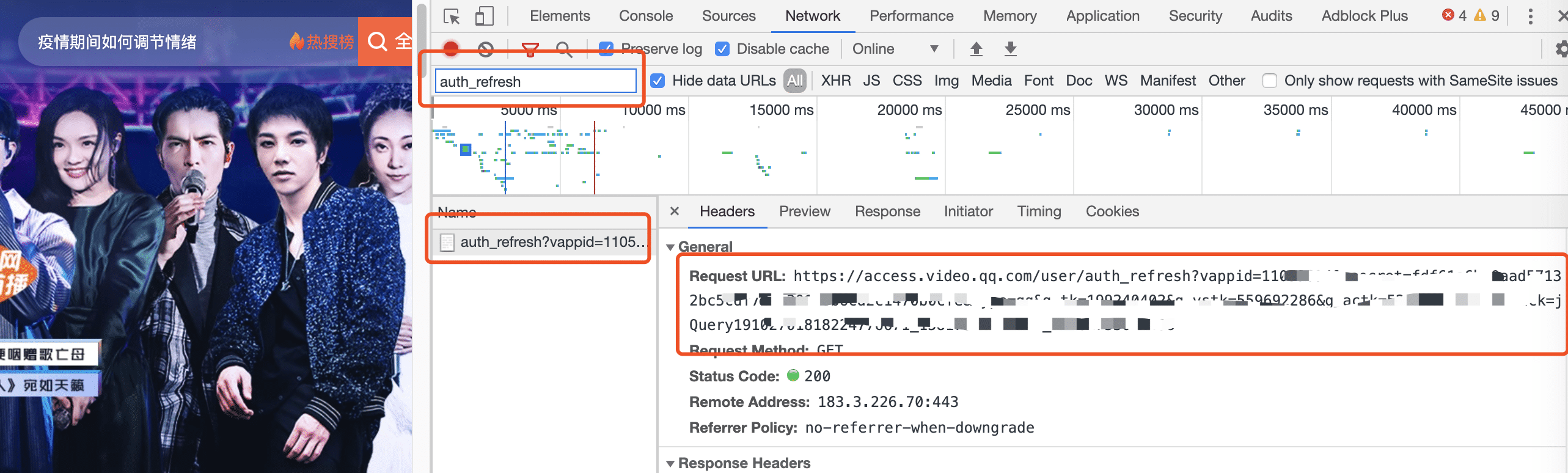 v.qq.com,打开控制台(F12)、切换到Network,找到https://access.video.qq.com/user/auth_refresh的接口,把Request URL:后的地址都复制一下,填写到脚本的auth_refresh_url中,如:
