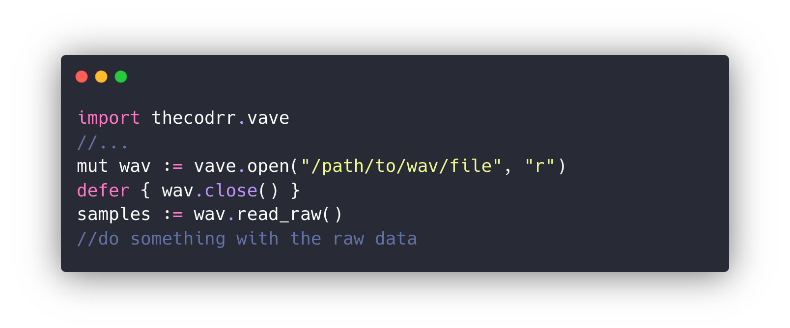 mut wav := vave.open("/path/to/vave/file", "r") //open for readingNOTES: The data is read into a byteptr and needs to be manually freed each and everytime or it will cause a huge memory leak. This library has been tested with valgrind and after freeing there is no other memory leak (if you find any, do report). I haven't implemented writing samples yet due to lack of time but its in my future plans.